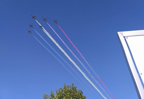 Бельгийские и французские пилоты вместе выполнили полет с цветным конденсационным следом.