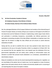 20 депутатов Европейского парламента, которые являются участниками неформальной группы "Друзья европейской Украины", призывают украинскую власть отменить электронное декларирование для общественных активистов, которые занимаются противодействием коррупции.