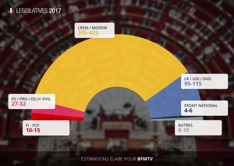 Согласно данным опроса центра Elabe для канала BFMTV и издания L'Express, альянс "Вперед, республика" - MoDem набирает от 395 до 425 мест в парламенте.