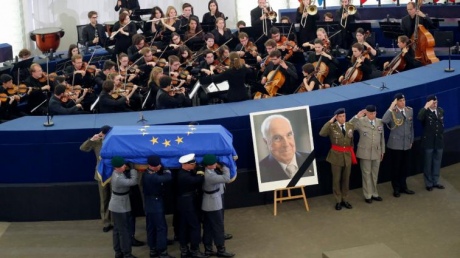 Церемония прощания происходит в помещении Европейского парламента. Гроб с телом бывшего канцлера покрывает флаг Европейского союза. Сессионный зал Европарламента полностью заполнен.
