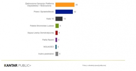 По данным опроса, союз оппозиционных партий "Гражданская платформа" и "Новочесна" способен получить поддержку 35% избирателей. Рейтинг правящей партии "Право и справедливость" снизился и составляет 32%.