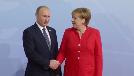 По прибытии Путина встречала канцлер Германии Ангела Меркель, которая приветствует всех участников саммита.