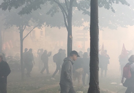 В Париже во время акции протеста против трудовой реформы Эммануэля Макрона полиция применила слезоточивый газ против демонстрантов.