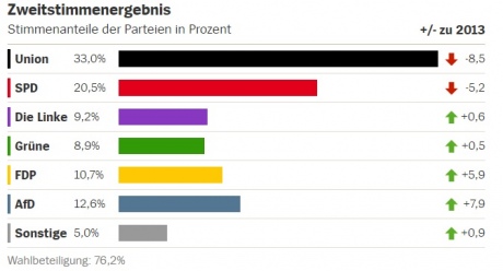 Блок партий Христианско-демократический союз и Христианско-социальный союз (ХДС/ХСС) во главе с Ангелой Меркель выигрывает выборы, получив 33% голосов. По сравнению с выборами 2013 года ХДС потерял 7,3% голосов, ХСС - 1,2%.