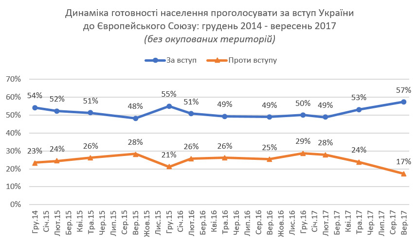 По сравнению с началом года поддержка идеи вступления Украины в ЕС среди населения продолжает расти: если в феврале 2017 года за вступление в ЕС были готовы проголосовать 49% населения, то в мае этого года - 53%, в сентябре - 57%.