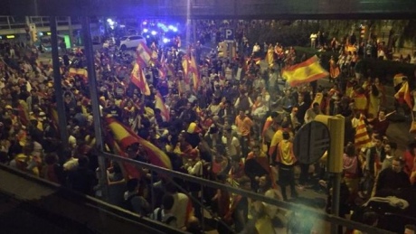 Протестующие с испанскими флагами, в основном футбольные фанаты после завершения мирной части протеста против независимости Каталонии напали на студию Catalunya Ràdio, которая входит в Каталанскую медиакорпорацию, и журналистов канала BTV.