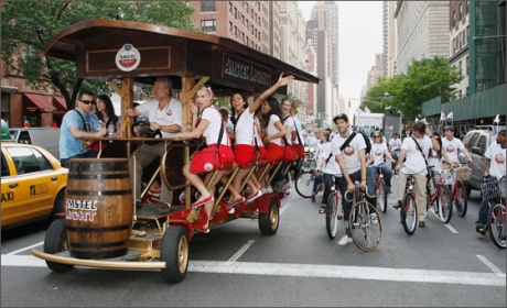 "Пивные велосипеды" - это своего рода пивные бары на колесах, которые движутся благодаря кручению педалей пассажирами. Они были достаточно популярны у туристов, однако местные жители постоянно жаловались на пьяных людей, которые пытались проехать по узким улочкам исторического центра города.
