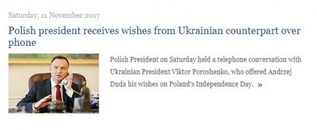 "Президент Польши в субботу провел телефонный разговор с президентом Украины Виктором Порошенко, который выразил Анджей Дуду свои пожелания в День независимости Польши", - говорится в сообщении.