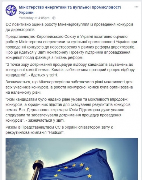 Представительство ЕС отреагировало на заявление Минэнергоугля, в котором утверждается, что Евросоюз положительно оценил работу министерства по проведению конкурсов в директораты.