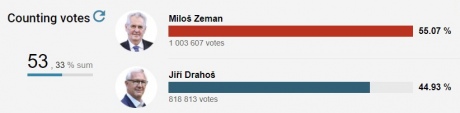Предварительный подсчет голосов также отдает победу Земану. После обработки более половины голосов избирателей Земан лидирует с 55%. Его оппонент, экс-глава Чешской академии наук Иржи Драгош получает поддержку 45%.