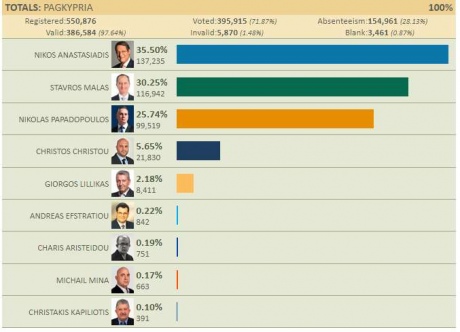 Анастасиадис набрал 35,50% голосов избирателей, вторым стал Ставрос Малас от коммунистической партии АКЭЛ - 30,25% голосов. Именно они вышли во второй тур выборов, который состоится через неделю, 4 февраля.