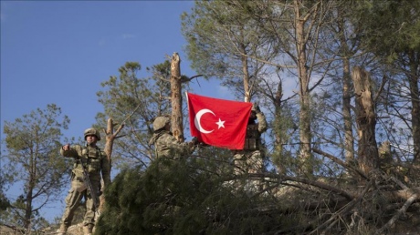 | Военные поднимают флаг Турции на горе Барсая (фото - Anadolu) |