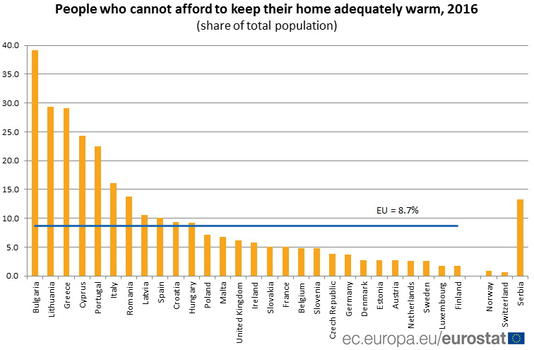 Наибольшая доля людей, которые утверждают, что не могут достаточно обогреть свой дом, была зарегистрирована в Болгарии (39%), за ней следуют Литва и Греция (29%), Кипр (24%) и Португалия (22%).