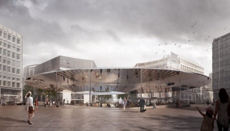 По задумке архитекторов, площадь, вокруг которой организовано круговое движение транспорта, будет превращена в пешеходную plaza, накрытую зеркальным металлическим навесом в форме американского пончика.