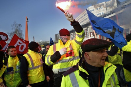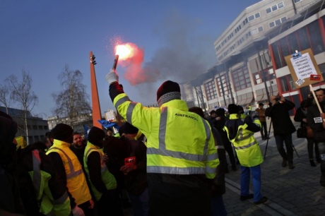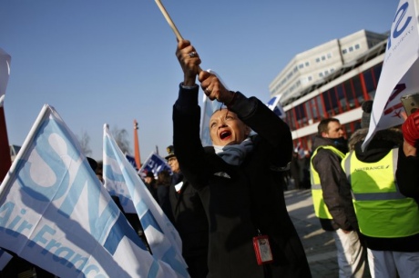 На фоне забастовки сотни разгневанных работников Air France вышли на демонстрацию перед штаб-квартирой французской авиакомпании в северной части Парижа.