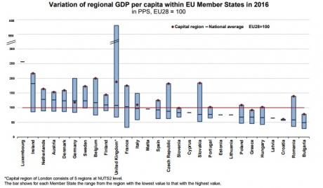 Ведущие места в рейтинге регионального ВВП на душу населения также занимают Герцогство Люксембург (257%), регион Юго-Восток в Ирландии (217%), Брюссель в Бельгии и Гамбург в Германии (оба 200%).