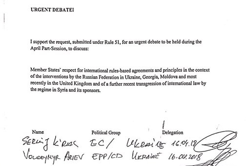 Предлагалось вынести на рассмотрение Ассамблеи по срочной процедуре вопрос о нарушении принципов ПАСЕ со стороны Российской Федерации, в частности относительно вмешательства в Украине, Грузии, Молдове и недавно в Великобритании, а также по поддержке действий сирийской власти, которые противоречат международному праву.