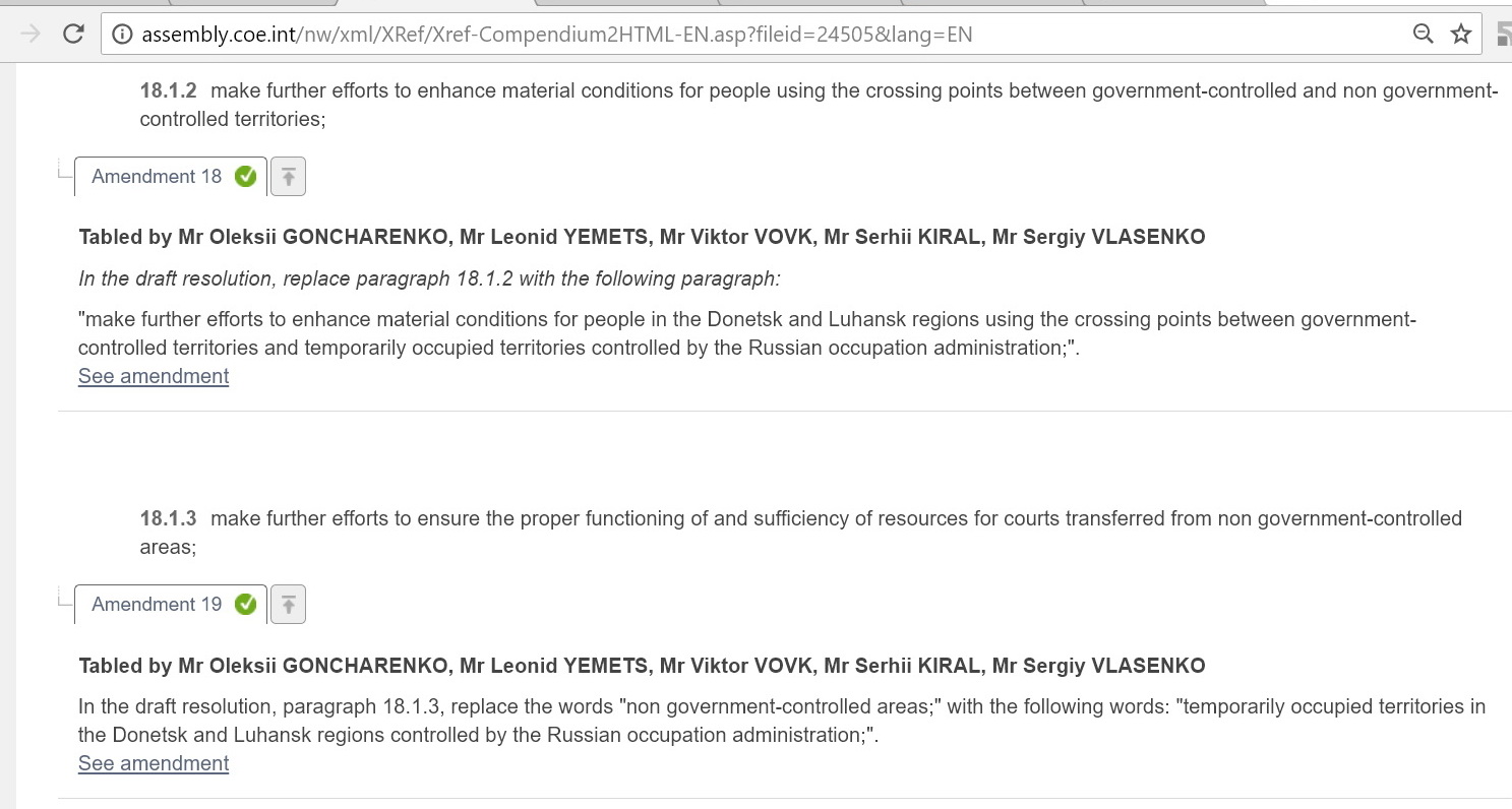 Во время рассмотрения украинского блока документа Ассамблея почти единогласно поддержала две поправки, которые подтверждают, что неконтролируемые правительством территории Донецкой и Луганской областей являются "территориями, которые находятся под фактическим управлением Российской Федерации" (territories under effective control by the Russian Federation).
