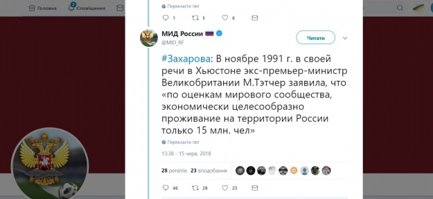 "В ноябре 1991 года в своей речи в Хьюстоне экс-премьер-министр Великобритании Маргарет Тэтчер заявила, что "по оценкам мирового сообщества, экономически целесообразно проживание на территории России только 15 млн чел.", — заявила Захарова.
