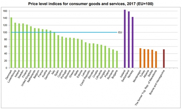 В 2017 году уровень цен на потребительские товары и услуги в Европейском Союзе сильно отличался, в некоторых странах они были почти в три раза больше, чем в других.