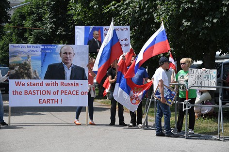 "Мы хотим приветствовать здесь российского президента и выразить нашу благодарность за то, что он в 2014 году спас Крым от украинских националистов", - заявила демонстрантка Ярослава Гиллер в футболке "Крым наш". Она представилась активисткой организации "Российская диаспора Крыма".