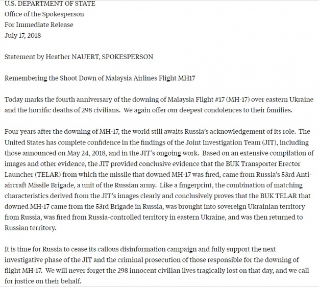 Госдеп США предыдущие три года обнародовал заявления о MH17, но в этом году не сделал этого, хотя оно было подготовлено. Годовщина была 17 июля, на следующий день после встречи Дональда Трампа с Владимиром Путиным в Хельсинки.