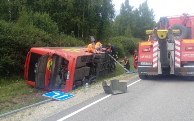 В результате столкновения автобус отбросило в кювет, он перевернулся на бок. Покореженный автомобиль остался на дороге.