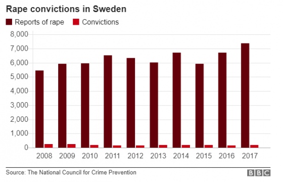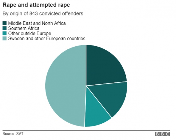 По данным шведского национального вещателя, около 58% мужчин, осужденных в Швеции за изнасилование или попытку изнасилования за последние пять лет, родились за границей.