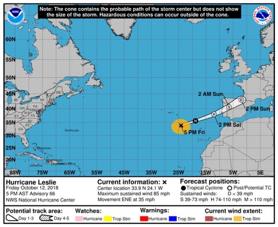 Как сообщает Национальный центр США по наблюдению за ураганами (NHC), 12 октября "Лесли" находился в 910 км к юго-западу от Лиссабона и в 320 км от Мадейры.