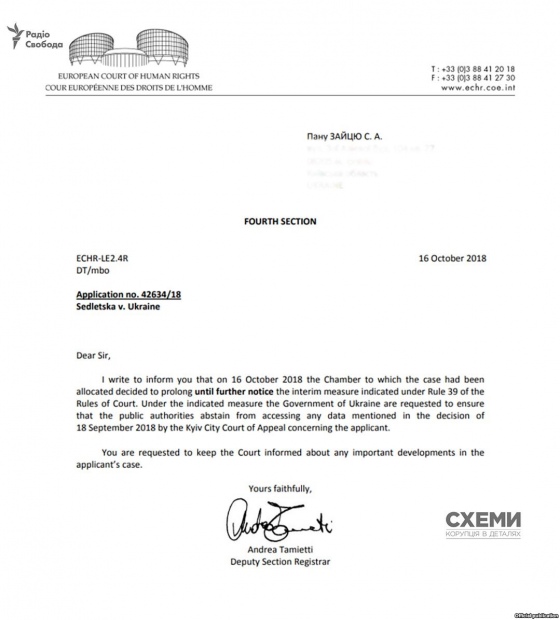 В обращении Наталья Седлецкая просила суд остановить сбор Генеральной прокуратурой Украины ограниченного перечня информации с ее телефона в течение 17 месяцев. Разрешение на сбор этой информации следствию выдал Апелляционный суд Киева 18 сентября 2018 года. В тот же день Европейский суд по правам человека указал правительству Украины, что оно должно обеспечить удержание органов власти от доступа к любым данным с телефона журналистки.