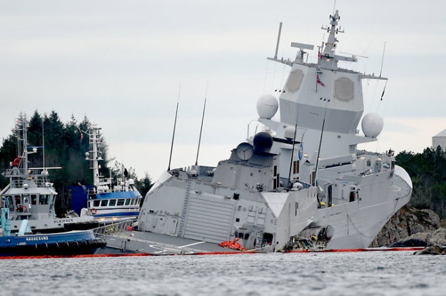 "Мы пытаемся поднять фрегат на землю. Нужно избежать рисков, что он сорвется и уйдет под воду", - сообщили в пожарном департаменте Норвегии.