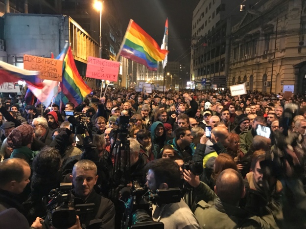Как сообщает Balkan Insight, несколько тысяч протестующих "1 из 5 миллионов" пришли к зданию парламента, выкрикивая "Вучич - вор".