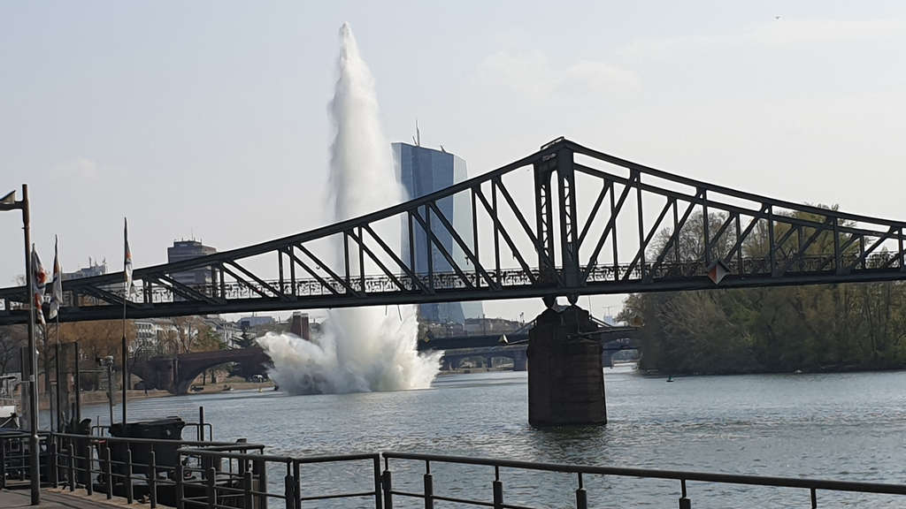 Согласно плану, бомбу взорвали под водой в воскресенье. Во время взрыва раздался громкий звук, на реке образовался большой фонтан.