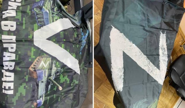 В частности, речь идет о партии камуфлированных костюмов и кепок, а также флагах, на которых нарисованы символы Z, V, танки с этими буквами, а внизу надпись "Сила в правде"