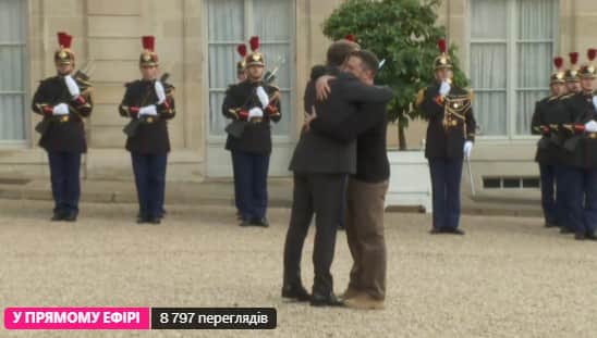 Около 16:20 Эмманюэль Макрон вышел на крыльцо и около минуты ожидал прибытия кортежа Зеленского, после чего вышел ему навстречу и дальше оба отправились внутрь дворца.
