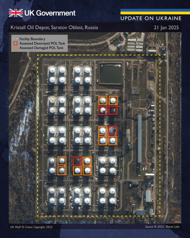 Анализ снимков от 21 января 2025 года показывает, что было уничтожено четыре цистерны с горюче-смазочными материалами, еще 10 повреждены.