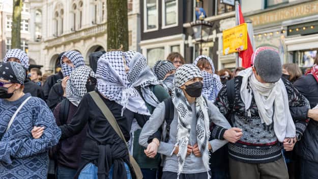 Около 100 активистов инициативы "Амстердамский студенческий лагерь" зашли в корпус Maagdenhuis Амстердамского университета, подняли палестинский флаг, вывесили баннеры из окон и зажгли файеры в цветах палестинского флага.