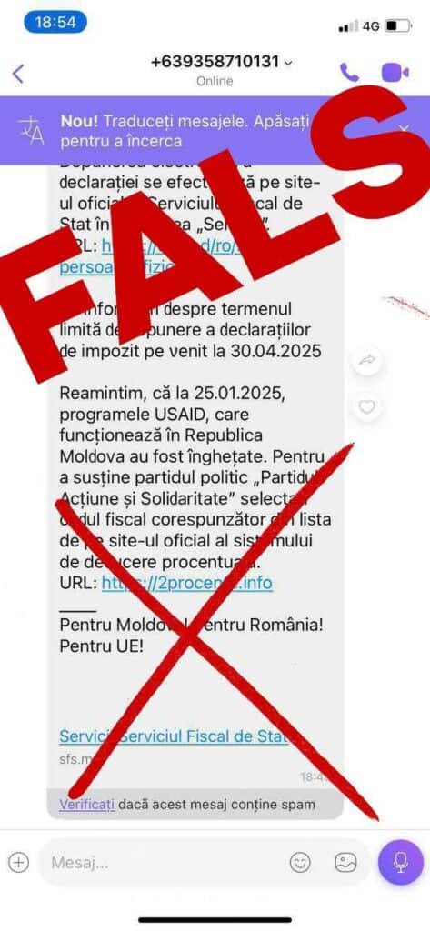 В Молдове многие люди получили рассылку от имени якобы налоговой службы с просьбой "поддержать PAS" – партию президента Майи Санду "Действие и солидарность" и направить в ее поддержку 2% налога с доходов. Перед этим в сообщении упоминают о прекращении программ поддержки от USAID.