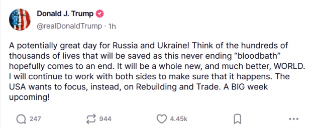 Трамп заявил о "потенциально великом дне для России и Украины", а также о "сотнях тысяч жизней, которые будут спасены, когда, надеемся, закончится эта бесконечная „кровавая бойня".