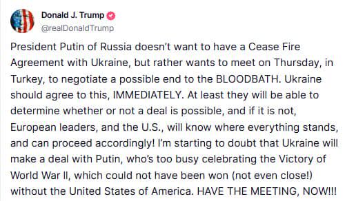 "Президент России Путин не хочет соглашения о перемирии с Украиной, но вместо этого хочет встретиться в четверг в Турции, чтобы вести переговоры о возможном прекращении кровопролития. Украина должна согласиться на это немедленно. По крайней мере, они смогут выяснить, возможно ли соглашение или нет, а если нет, то европейские лидеры и США будут понимать, какова ситуация, и смогут действовать соответственно", – написал Трамп, по своему обыкновению выделяя отдельные слова заглавными буквами.