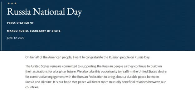 Государственный секретарь США Марко Рубио опубликовал официальное поздравление ко Дню России.