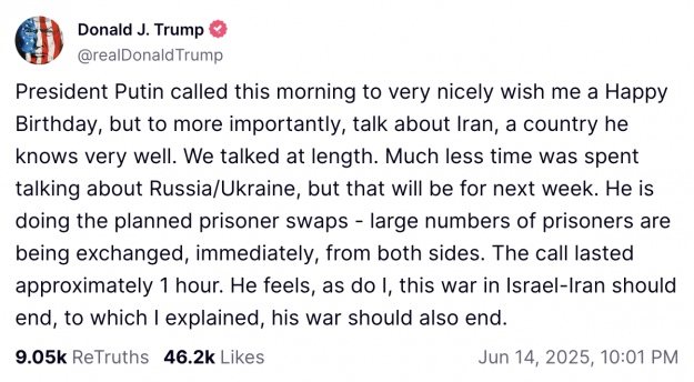 По словам Трампа, Путин сказал ему, что война между Израилем и Ираном должна закончиться, "на что я ответил, что его война (то есть вторжение в Украину. – Ред.) также должна закончиться".
