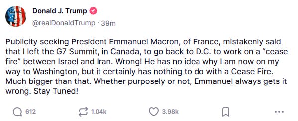 "Президент Франции Эмманюэль Макрон, который стремится к публичному вниманию, ошибочно сказал, что я оставил саммит G7 в Канаде и вернулся в Вашингтон, чтобы работать над "перемирием" между Израилем и Ираном. Ошибка!" – написал Трамп.