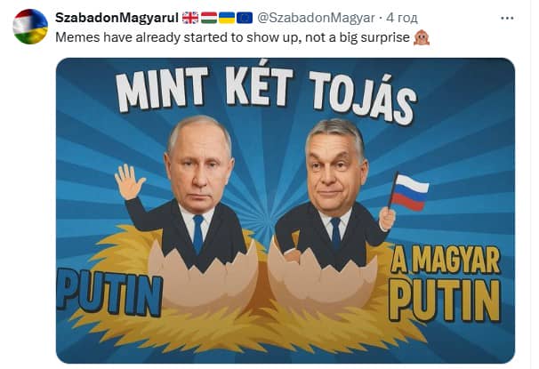 В соцсети Х уже публикуют мемы, созданные в ответ на новую кампанию – вместо Зеленского и Мадяра в половинках яиц изображены правитель РФ Владимир Путин и венгерский премьер Виктор Орбан.