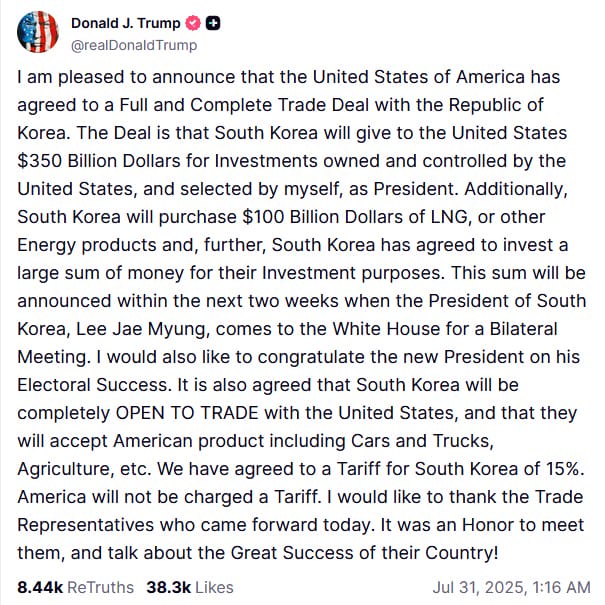 Президент США Дональд Трамп объявил, что Штаты и Южная Корея достигли договоренности о новых условиях торговли с тарифами 15% на корейский импорт.