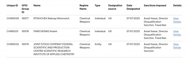 Под санкции Великобритании попал российский Научно-исследовательский институт прикладной химии, а также начальник войск радиологической, химической и биологической защиты Алексей Ртищев и его заместитель Андрей Марченко.