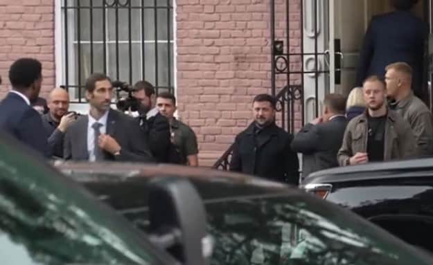Встречая европейских лидеров у посольства Украины в Вашингтоне в понедельник, президент Зеленский был одет в черную рубашку и черный пиджак.