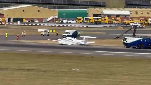 На фотографиях, распространенных в социальных сетях, видно, что небольшой винтовой самолет стоит на взлетно-посадочной полосе седьмого по загруженности аэропорта Великобритании.