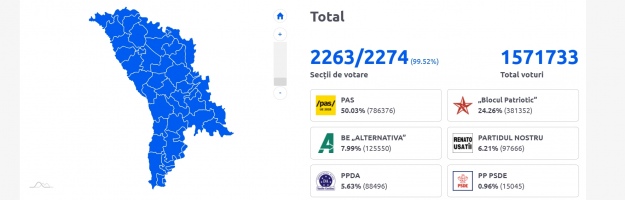 Действующая партия власти Молдовы "Действие и солидарность" (PAS) после подсчета 99,5% голосов на парламентских выборах, прошедших в воскресенье, пересекла 50-процентный барьер поддержки избирателей.