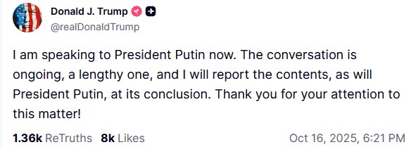 Около 11:20 по Вашингтону (18:20 по Киеву) Трамп опубликовал пост о том, что "сейчас разговаривает" с Владимиром Путиным.